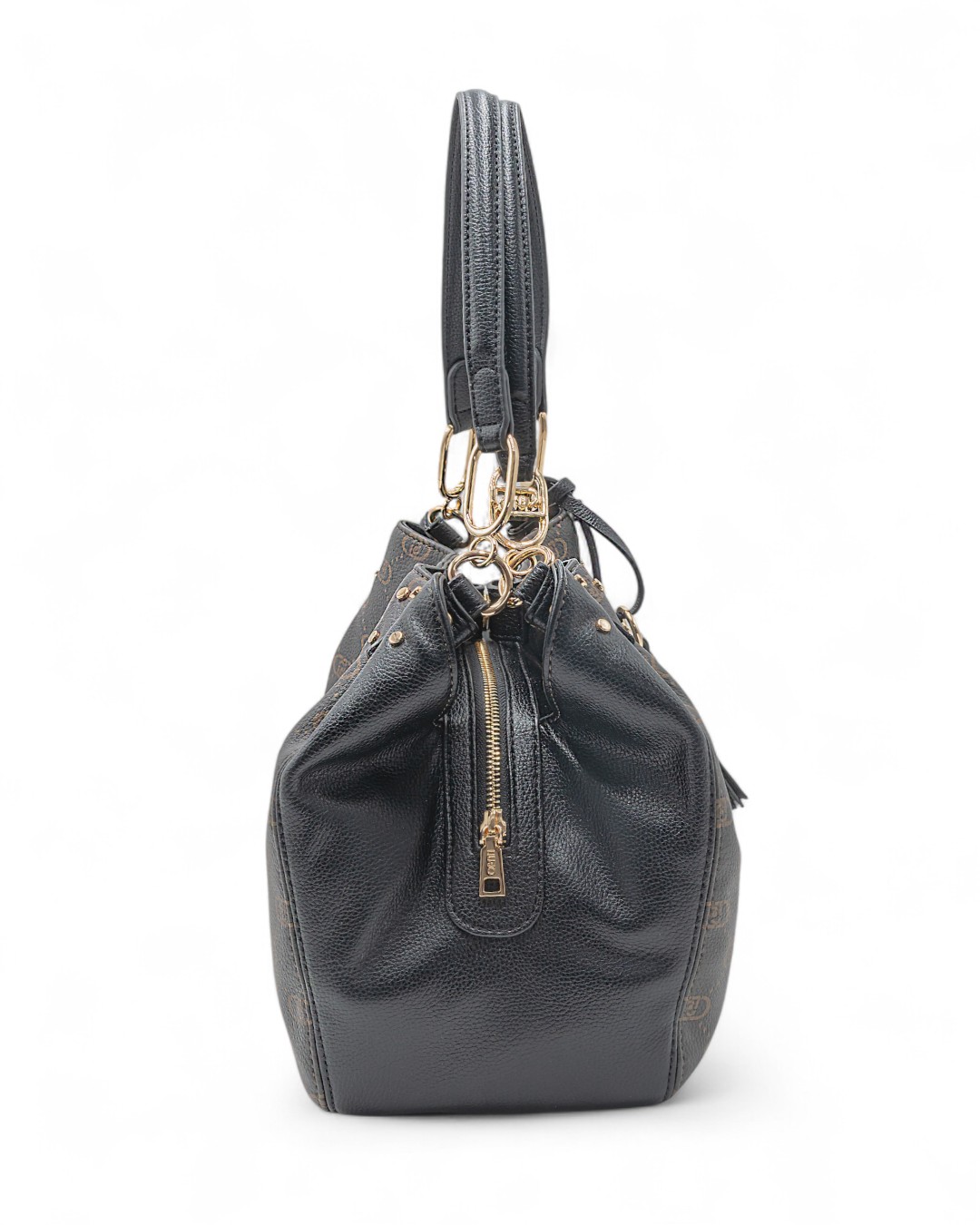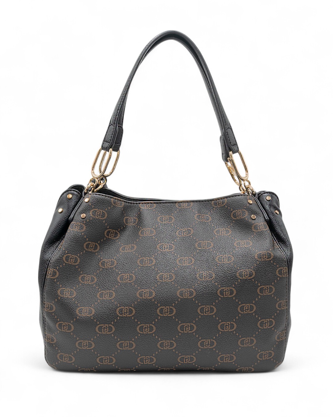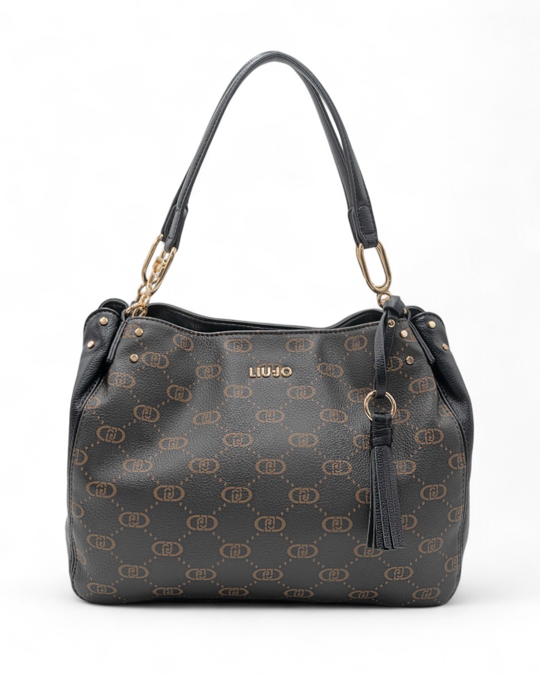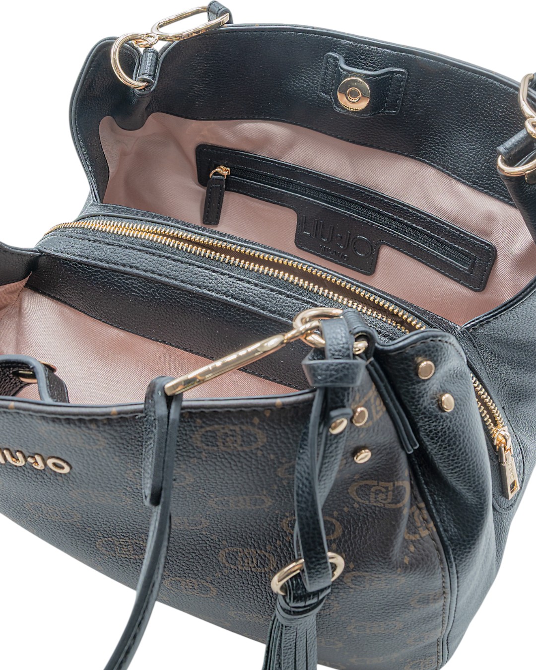 Borsa da donna Liu Jo modello cartella a spalla, realizzata in ecopelle, con stampa multilogo. Dotata di logo metallico frontale, inserti laterali in ecopelle, due manici in ecopelle, accessorio pendente decorativo, 3 scomparti (centrale chiuso con zip e laterali con bottone magnetico).